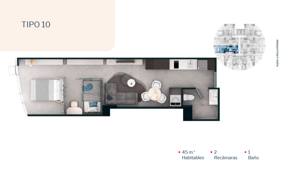 - Tipo 10: 45 m2 / 2 recámaras, 1 baño.