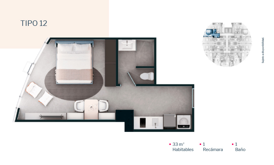 - Tipo 12: 33 m2 / 1 recámara, 1 baño.
