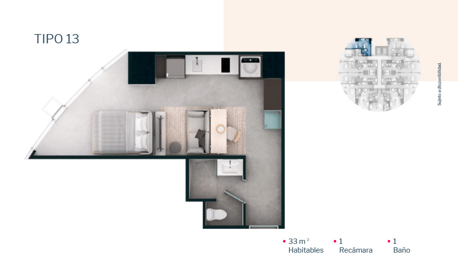 - Tipo 13: 33 m2 / 1 recámara, 1 baño.