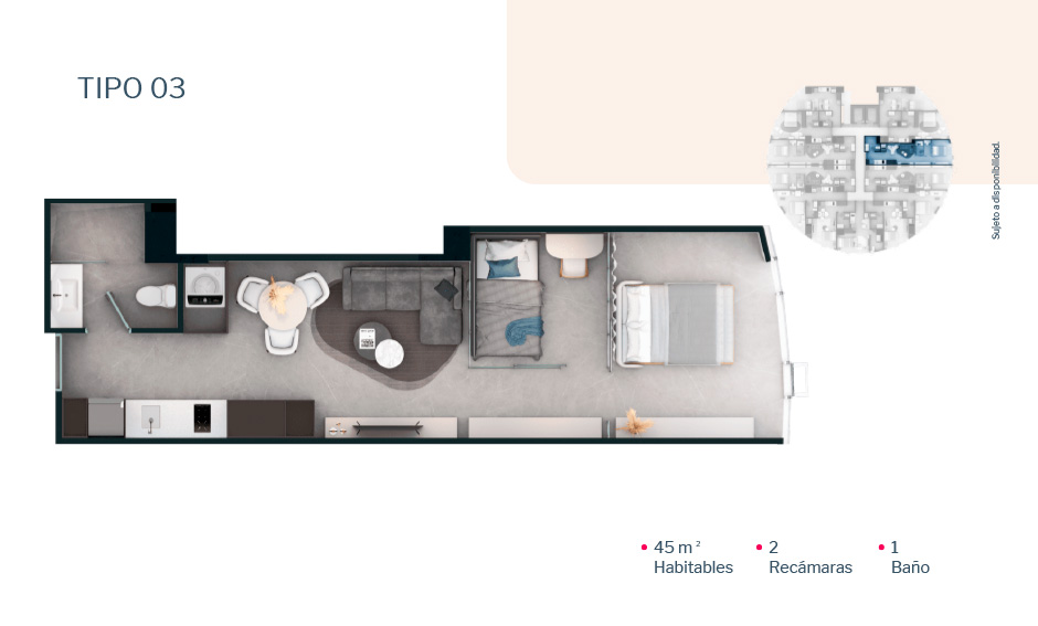 - Tipo 3: 45 m2 / 2 recámaras, 1 baño.