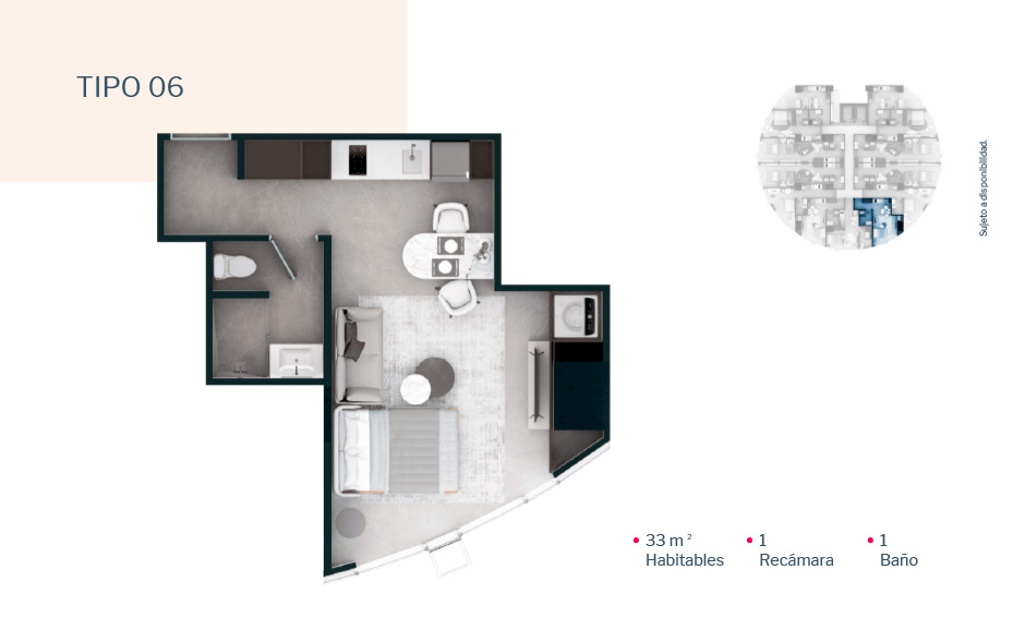 - Tipo 6: 33 m2 / 1 recámara, 1 baño.