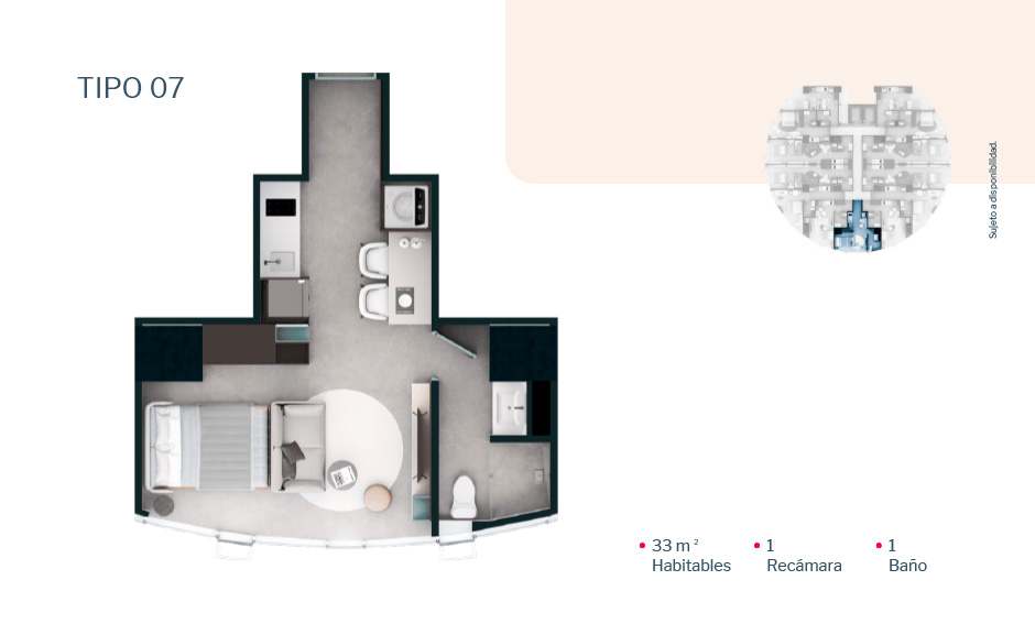 - Tipo 7: 33 m2 / 1 recámara, 1 baño.
