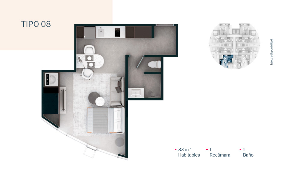 - Tipo 8: 33 m2 / 1 recámara, 1 baño.