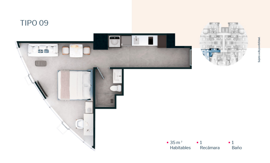- Tipo 9: 35 m2 / 1 recámara, 1 baño.