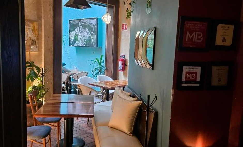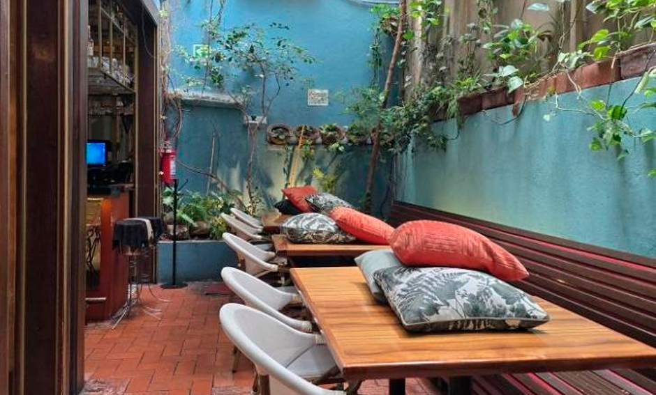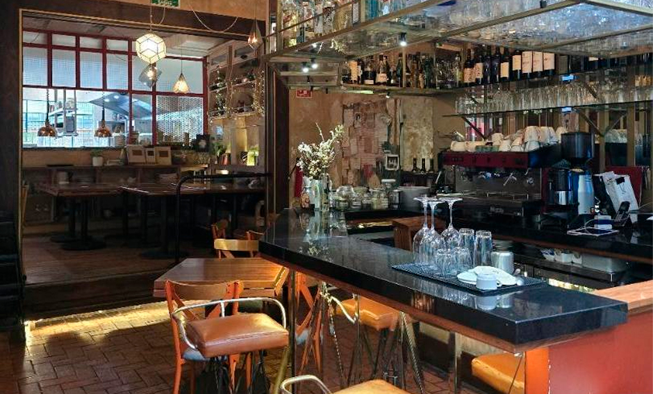 Cuenta con una barra fija estratégicamente colocada al centro del local, y una terraza al fondo.