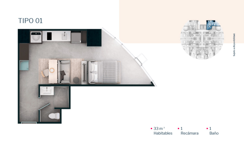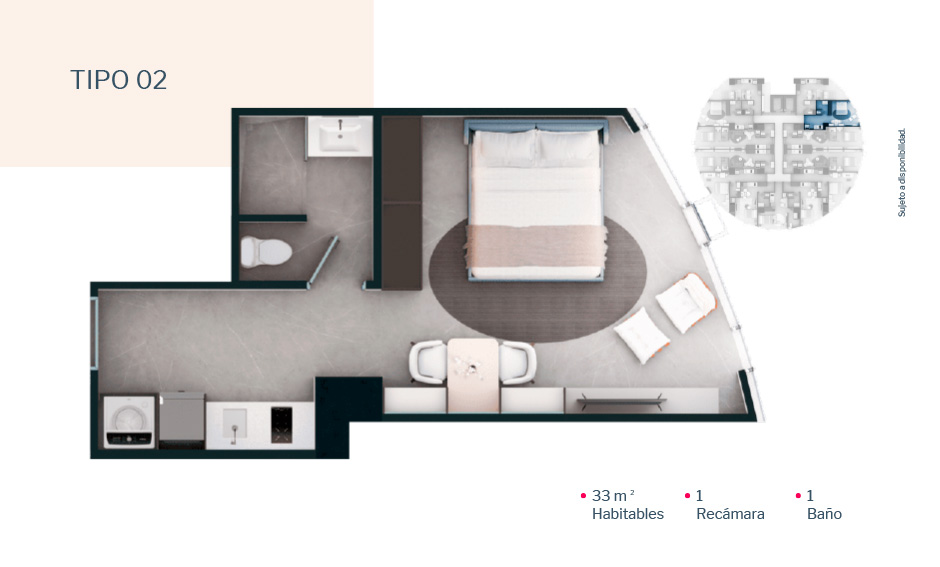 - Tipo 1: 33 m2 / 1 recámara, 1 baño.