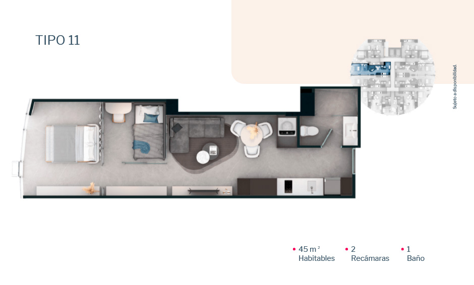 - Tipo 11: 45 m2 / 2 recámaras, 1 baño.