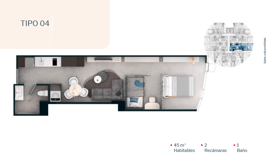 - Tipo 4: 45 m2 / 2 recámaras, 1 baño.