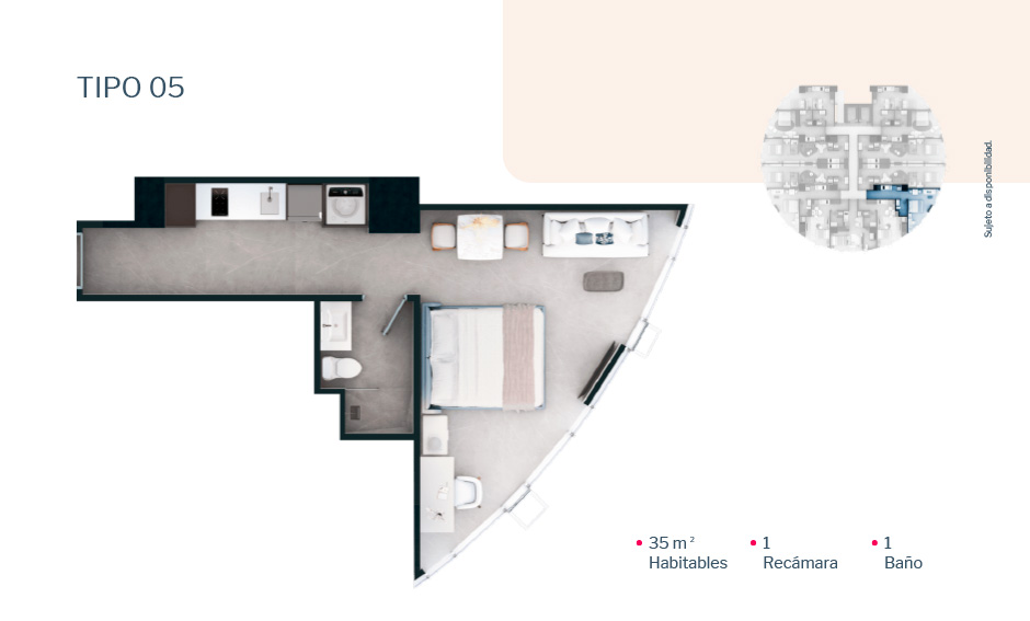 - Tipo 5: 35 m2 / 1 recámara, 1 baño.